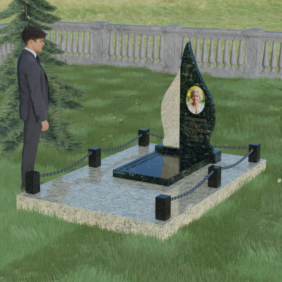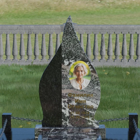 Выбор мемориального изделия — это всегда глубоко личный процесс, стремление выразить в камне ту нежность и уважение, которые мы храним в сердце. Модель 018 воплощает в себе гармонию и завершенность. Величественная стела выполнена в форме изящного, стремящегося ввысь пламени или капли, что символизирует вечный свет души и неугасаемую память. Асимметричная геометрия с мягкими, плавными изгибами лишена острых углов, что подчеркивает идею спокойствия и вечного упокоения. Особое внимание привлекает сочетание двух контрастных видов камня: светлая левая часть стелы с её благородной зернистой фактурой мягко огибает темную зеркальную сердцевину. Этот контраст создает визуальный объем и глубину, подчеркивая уникальность композиции и делая её заметной на фоне традиционных строгих форм.