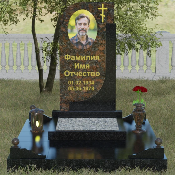 Данная модель отличается уникальной комбинированной архитектурой, которая мгновенно приковывает взгляд за счет игры форм и цветов. Основная вертикальная стела имеет асимметричный силуэт: ее левая сторона плавно закругляется, образуя изящную волну, в то время как правая грань остается подчеркнуто строгой и прямой. Это сочетание мягкости и твердости символизирует дуальность жизни. С правой стороны стелу дополняет контрастная вертикальная вставка из камня другого оттенка, которая придает всей конструкции объем и архитектурную завершенность. В верхней части основной плиты лаконично расположен православный восьмиконечный крест, выполненный методом глубокой гравировки с последующим золочением. Его строгие линии подчеркивают духовную значимость монумента, не перегружая общую композицию лишними деталями.