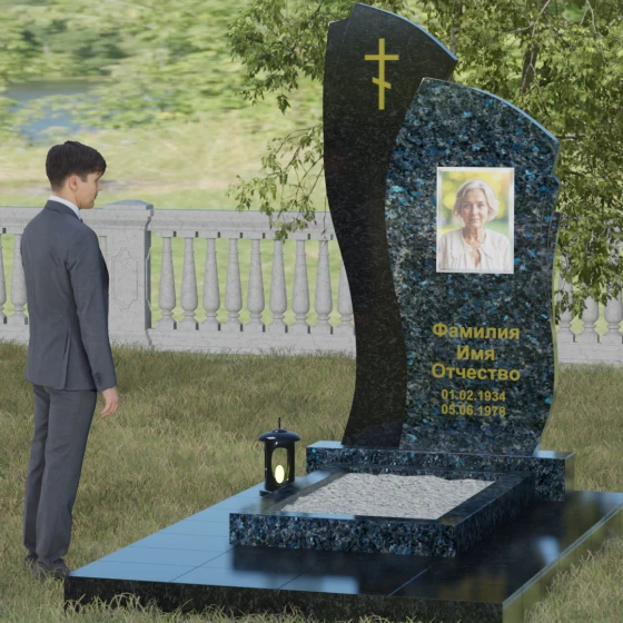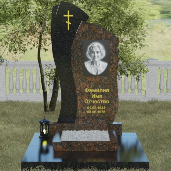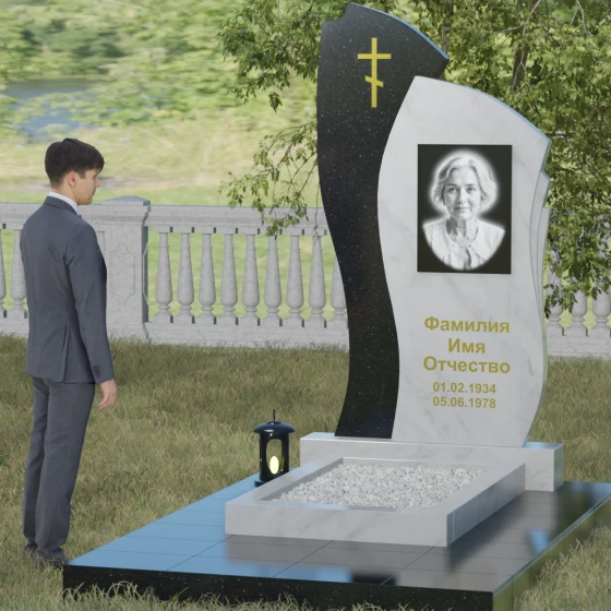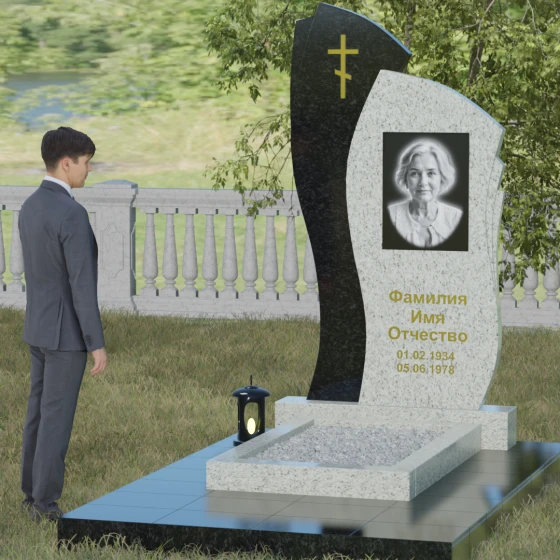 Данное ритуальное изделие представляет собой сложную художественную композицию, в которой мастерски обыгран контраст форм и материалов. В центре внимания — двухсоставная стела, объединяющая в себе мягкость восходящей линии и решительную геометрию скалы. Левый сегмент выполнен в виде изящной, тянущейся к небу волны из светлого камня, на которой лаконично расположился золоченый православный крест. Правая часть, служащая основанием для портрета, притягивает взгляд своей необычной обработкой: её внешний торец выполнен с каскадной, ступенчатой резкой, создающей эффект многослойности и глубины. Такая асимметрия символизирует сложность жизненного пути и возвышенность души.