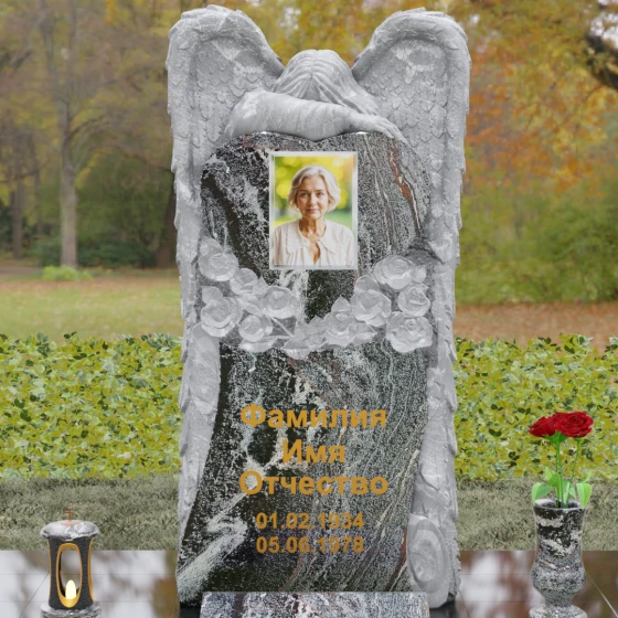 Данная мемориальная композиция представляет собой истинное произведение ритуального искусства, где каждый элемент пропитан глубоким символизмом и благородством. Центральным художественным образом выступает величественная фигура скорбящего ангела, чьи массивные крылья бережно, словно в последней попытке защитить, обрамляют стелу в форме сердца. Мастерство камнереза здесь проявляется в искусной игре контрастов: матовая, детально проработанная фактура оперения крыльев и драпировок одежды небесного покровителя противопоставлена зеркально отполированной глади черного гранита. Именно на этой поверхности, лишенной малейших изъянов, свет преломляется наиболее эффектно, создавая ощущение глубины и монументальности.