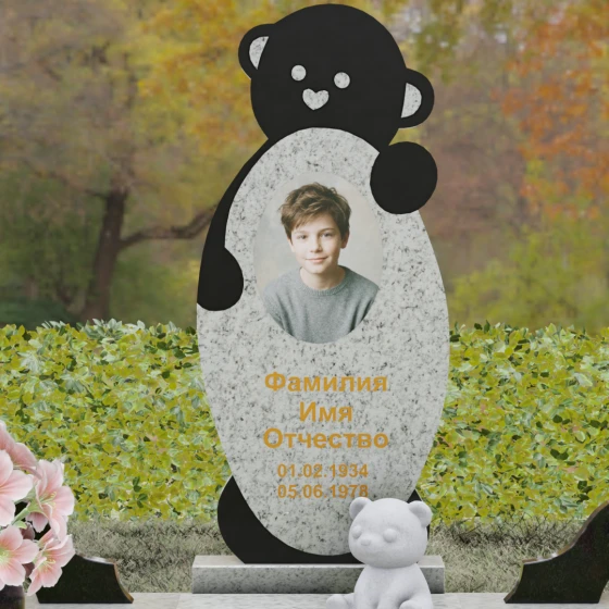 Особое внимание уделено деталям резьбы: носик медвежонка выполнен в форме небольшого сердца, что придает всей конструкции особую эмоциональную глубину. Центральная часть стелы предназначена для размещения классического овального портрета, который гармонично вписывается в общую геометрию. Грани камня обработаны с ювелирной точностью — фаски мягко преломляют свет, подчеркивая безупречную чистоту природного материала и высокое мастерство камнерезов.
