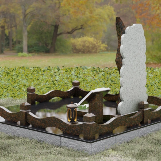Модель «Артикул 188» представляет собой сложную архитектурную композицию, построенную на эффектном контрасте форм и материалов. Центральная стела выполнена в асимметричном стиле: основная часть из темного гранита имеет строгую вертикальную направленность с резким, устремленным ввысь навершием. Левая грань стелы украшена четырьмя четкими диагональными ступенчатыми вырезами, которые придают памятнику динамику и подчеркивают твердость характера усопшего. Эта темная плита словно «вырастает» из обрамления из светлого камня, край которого обработан в виде мягких, пушистых облаков или морской пены.