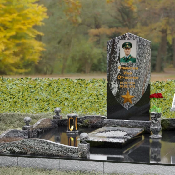 Форма щита в мемориальной архитектуре традиционно олицетворяет защиту, честь и непоколебимую волю. Это надгробие из натурального камня словно оберегает покой усопшего, напоминая о его мужестве и твердости духа. Выбор именно такой формы подчеркивает, что человек при жизни был опорой для своей семьи и преданно служил своему делу. Звезда и строгие формы акцентируют внимание на дисциплине и преданности идеалам.