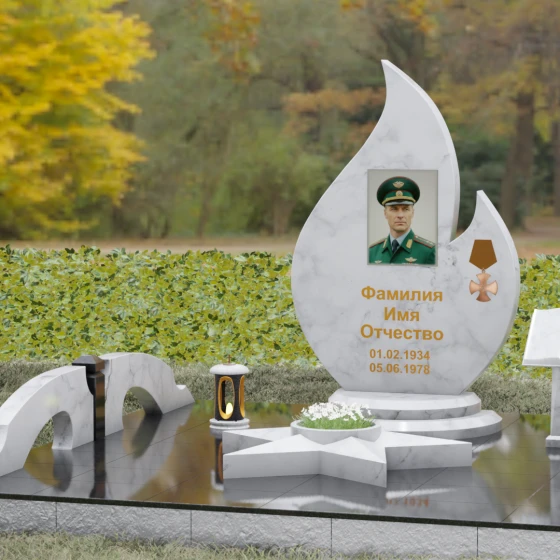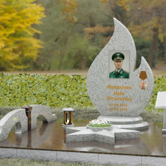 Центральное мемориальное изделие выполнено в уникальной форме застывшего пламени, которое стремится ввысь, символизируя неугасаемую энергию жизни. Плавные, текучие изгибы боковых граней переходят в изящное заостренное навершие, создавая динамичный и одновременно строгий силуэт. Особое внимание стоит уделить обработке камня: по всему периметру лицевой грани снята широкая фаска, которая благодаря безупречной зеркальной полировке создает великолепную игру света и тени, подчеркивая объем и скульптурность формы.