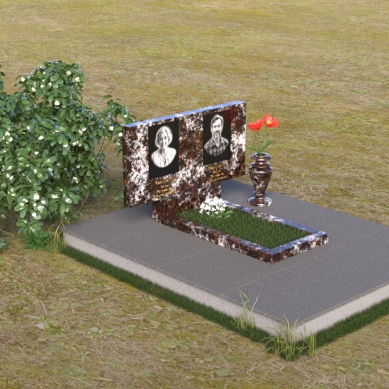 Представленный памятник (артикул ПГ001) являет собой образец строгости и лаконичности, где каждая деталь подчинена общей концепции увековечивания памяти. Композиция состоит из основания, облицованного серыми плитами, горизонтальной плиты, и вертикальной плиты с портретами. Дополнительно предусмотрена тумба для вазы.