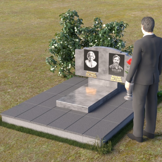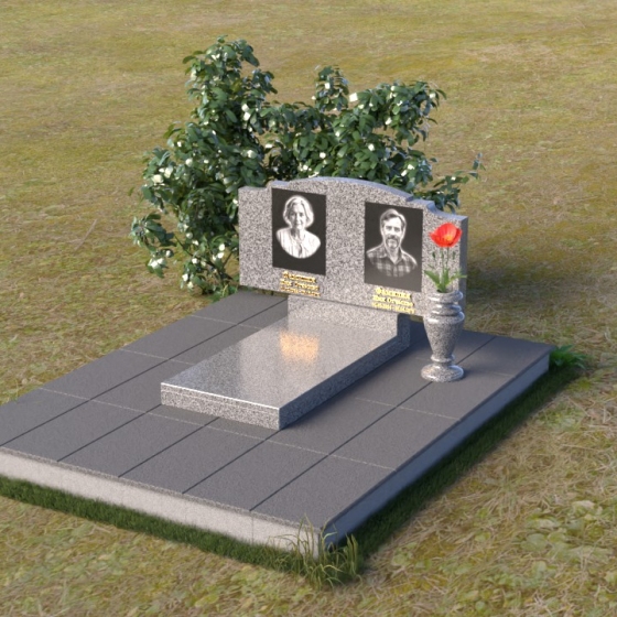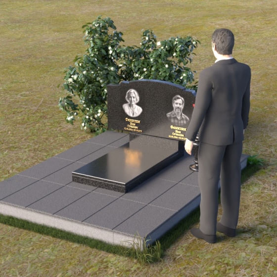 Этот гранитный монумент представляет собой композицию, где каждая деталь продумана до мелочей. Верхняя часть памятника имеет фигурную форму с плавными, волнообразными очертаниями, словно застывшая мелодия скорби. Верхний край обработан таким образом, что создает впечатление легкой, воздушной драпировки. Боковые грани аккуратно скруглены, смягчая строгость камня и придавая ему более изящный вид. Фаски, снятые по периметру, подчеркивают контур и добавляют выразительности. Лицевая поверхность отполирована до зеркального блеска, отражая свет и создавая ощущение глубины. На полированной поверхности выгравированы портреты усопших и памятные надписи, выполненные с особой тщательностью и вниманием к деталям. Под основной плитой располагается горизонтальная плита, также выполненная из черного гранита, создающая дополнительный уровень и подчеркивающая монументальность композиции. На ней размещена еще одна полированная плита, но уже меньшего размера, как символ нерушимости и продолжения рода.