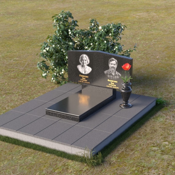 Величественная стела памятника ПГ009 выполнена в строгой, но элегантной форме. Верхняя часть представляет собой слегка асимметричную трапецию со скошенными углами, что придает ей современный и лаконичный вид. Боковые грани стелы отполированы до зеркального блеска, создавая глубокий черный цвет, который служит идеальным фоном для гравировки портретов и надписей. Нижняя часть стелы переходит в горизонтальную плиту, также тщательно отполированную, что создает единую композицию. Эта плита, в свою очередь, венчает небольшую прямоугольную тумбу, выполненную в том же стиле, обеспечивая устойчивость и завершенный вид.