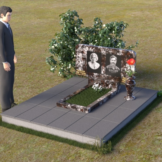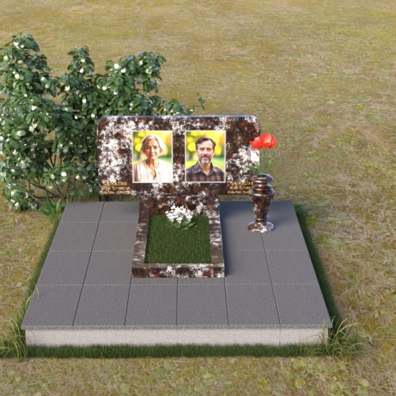 Этот ритуальное изделие – воплощение сдержанной элегантности и глубокого уважения. Прямоугольная стела с мягко скругленными углами создает ощущение завершенности и покоя. Верхняя часть памятника, словно рамка для воспоминаний, украшена выгравированными портретами. Полированная поверхность камня, подобно зеркалу, отражает свет, создавая игру бликов и теней, что придает глубину и объем изображениям. Горизонтальная плита под портретами добавляет композиции устойчивости и визуально расширяет пространство. Все элементы памятника объединены лаконичным дизайном, который говорит о достоинстве и вечной памяти.