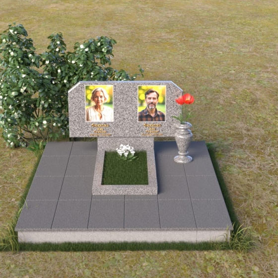 Этот ритуальное изделие (артикул ПГ027) – это не просто надгробный памятник, это способ выразить вашу любовь и уважение к ушедшему близкому человеку. Его строгая, но в то же время элегантная форма, с аккуратно скошенными углами верхней части, символизирует сдержанную скорбь и вечную память. Зеркальная полировка черного камня создает эффект глубины и объема, отражая небо и окружающий мир, словно напоминая о том, что душа усопшего нашла свой покой. Прямоугольная стела, установленная на подставке, выглядит лаконично и достойно. На полированной поверхности отчетливо видны портреты усопших, выгравированные с высокой точностью и детализацией. Композицию завершает ваза из того же материала, в которой можно разместить живые или искусственные цветы, как символ непреходящей любви и памяти. Одинокий красный мак, помещенный в вазу на изображении, служит трогательным акцентом, напоминающим о хрупкости жизни и необходимости ценить каждый момент.