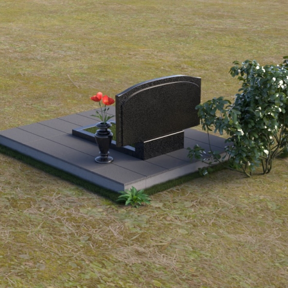 В нижней части стелы располагается прямоугольная вставка, также выполненная в полированном черном граните, что создает визуальный контраст и добавляет монументальности. Перед стелой установлена горизонтальная плита, повторяющая форму верхней части стелы, что придает композиции завершенность и гармонию. Рядом с памятником располагается ваза из черного гранита, в которой можно разместить живые цветы, символизирующие вечную память и любовь.
