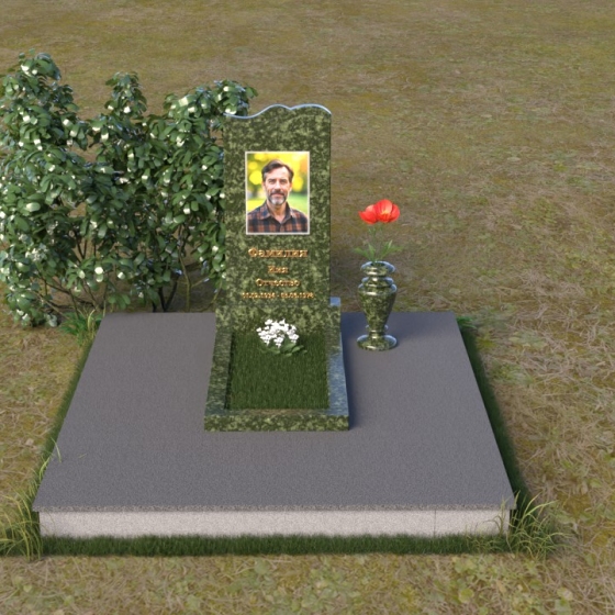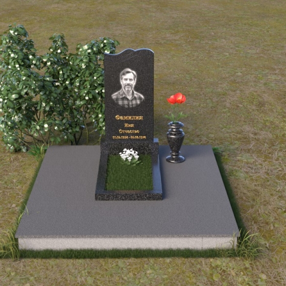 Этот гранитный монумент представляет собой вертикальную плиту с плавной, волнообразной линией верха, словно застывшая морская волна, несущая в себе покой и умиротворение. Боковые грани надгробного сооружения мягко скруглены, что придает ему изящный и завершенный вид. Верхняя часть памятника, обрамляющая портрет усопшего и памятную надпись, выполнена в строгом прямоугольном стиле, подчеркивая лаконичность и сдержанность дизайна. Нижняя часть памятника переходит в горизонтальную плиту, создавая единую композицию, гармонично вписывающуюся в окружающий ландшафт. Фаски по периметру обеих плит аккуратно сняты, что придает изделию дополнительную элегантность и законченность.