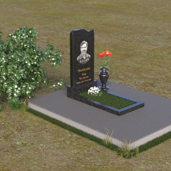 Надгробие начинается с массивного основания, выполненного в форме прямоугольной плиты. Его поверхность имеет матовую, слегка шероховатую фактуру, что создает контраст с глянцевыми элементами верхней части. На основании установлена горизонтальная плита, выполненная из полированного черного гранита. Зеркальная поверхность отражает небо и окружающий ландшафт, создавая ощущение глубины и простора. Вертикальная стела, расположенная в задней части композиции, является доминантой всего ансамбля. Ее верхняя часть имеет плавный, волнообразный изгиб, смягчающий строгие геометрические формы. На лицевой стороне стелы выгравирован портрет усопшего, а также имя, фамилия, отчество и даты жизни, выполненные золотистыми буквами. С правой стороны от стелы размещена небольшая гранитная ваза строгой формы, предназначенная для живых или искусственных цветов.