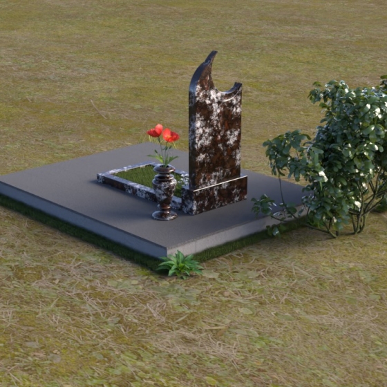 Этот гранитный монумент притягивает взгляд своей необычной формой. Основной элемент – вертикальная плита, увенчанная плавной, асимметричной дугой, напоминающей полумесяц. Её левая сторона чуть выше правой, что создает ощущение динамики и незавершенности, словно оборвавшейся жизни. Поверхность лицевой стороны отполирована до зеркального блеска, отражая небо и окружающий пейзаж, создавая иллюзию глубины и пространства. На полированной поверхности выгравирован портрет усопшего, надпись с именем и датами жизни. Нижняя часть монумента, сопрягаясь с горизонтальной плитой, образует единый ансамбль. Переход между вертикальной и горизонтальной плоскостями подчеркнут небольшой ступенькой, добавляющей конструкции объема. Горизонтальная плита, в свою очередь, также отполирована до блеска, отражая свет и усиливая эффект монументальности. Фаски на гранях плиты аккуратно обработаны, что придает памятнику завершенный и элегантный вид. Сбоку от монумента расположена небольшая гранитная ваза, предназначенная для живых цветов, которые станут символом вечной памяти и любви.