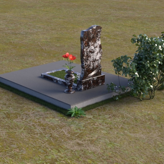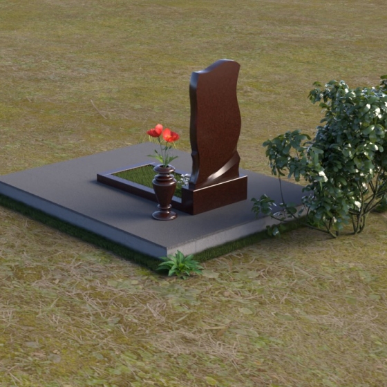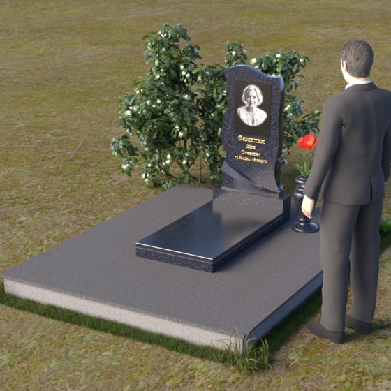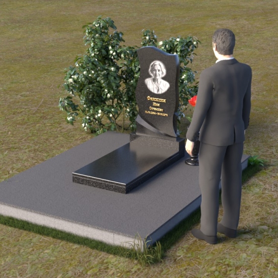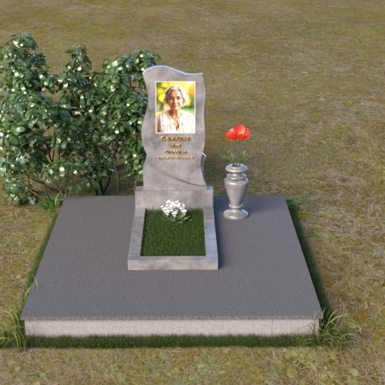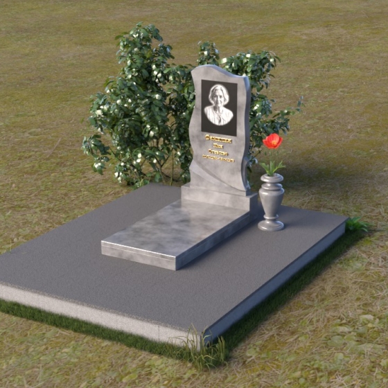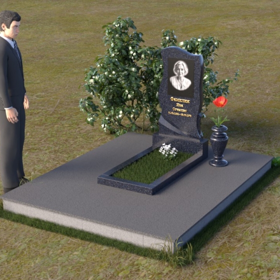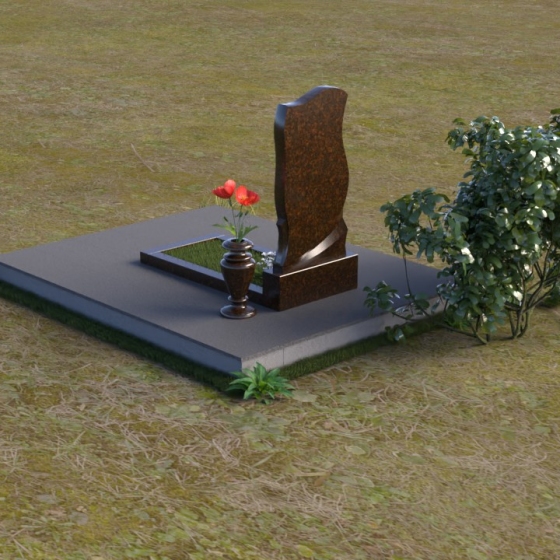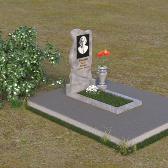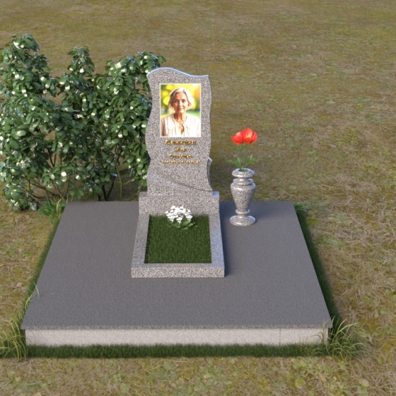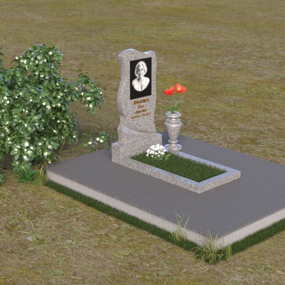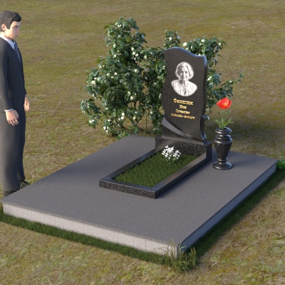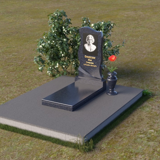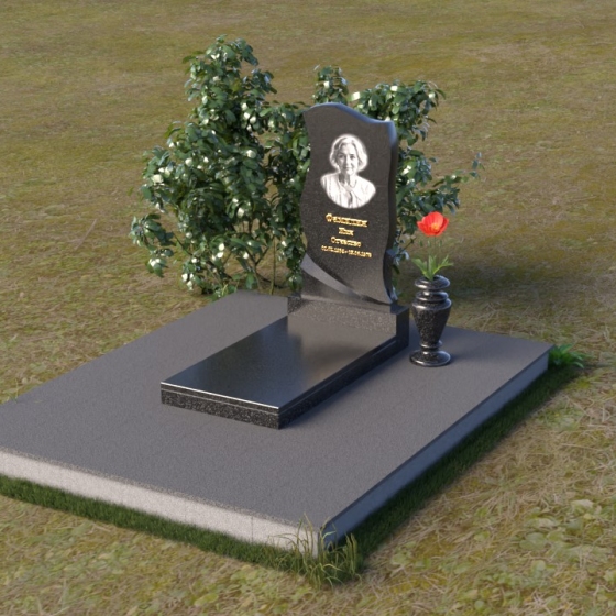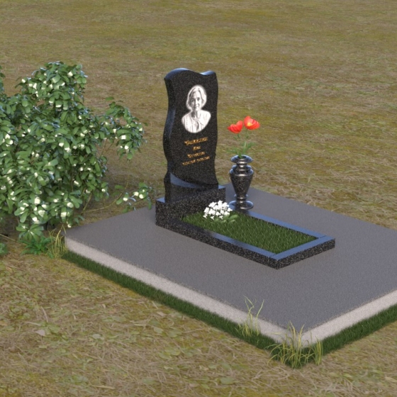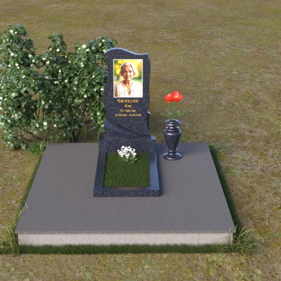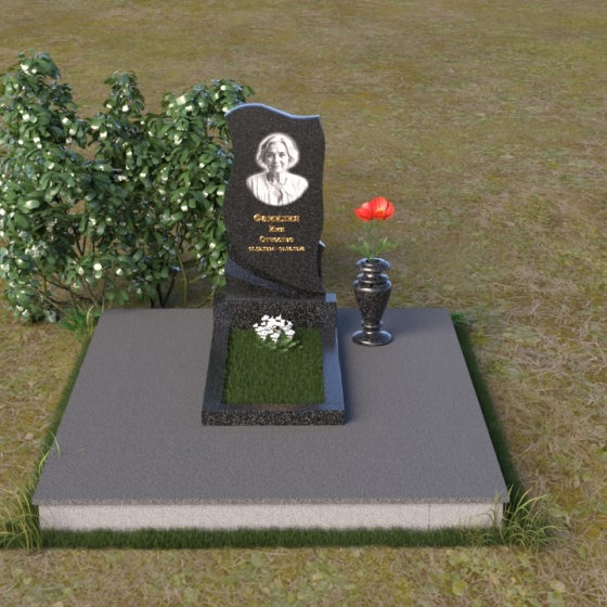 Этот памятник представляет собой элегантную композицию, где плавные линии сочетаются с четкими гранями. Стела имеет форму, напоминающую развевающееся знамя или крыло ангела, стремящееся ввысь. Верхняя часть памятника мягко изогнута, образуя изящный силуэт. Боковые стороны волнообразные, с одной стороны вырезан плавный каскад, словно драпировка, с другой стороны волна более пологая. Лицевая поверхность стелы отполирована до зеркального блеска, что создает эффект глубины и подчеркивает благородство камня. В нижней части стелы вырезана плавная дуга, отделяющая основную часть от основания. Подставка под стелу выполнена в форме прямоугольной плиты с полированной верхней поверхностью и фасками по периметру, что придает ей законченный вид. Дополнительная горизонтальная плита, также отполированная, устанавливается перед стелой, создавая место для цветов или свечей. Все элементы памятника гармонично сочетаются друг с другом, создавая впечатление легкости и воздушности.