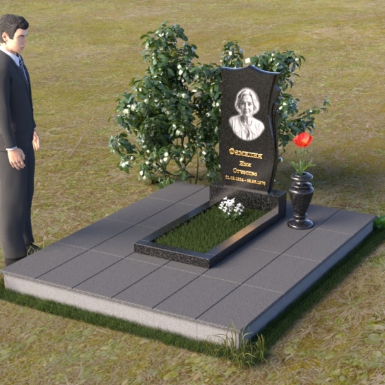 Основание памятника выполнено в виде горизонтальной плиты с зеркальной полировкой, которая отражает небо и окружающий ландшафт, создавая эффект легкости и воздушности. Дополнительная горизонтальная плита, расположенная ниже, служит надежной опорой для всей конструкции. Небольшая ваза, выполненная в едином стиле с памятником, предназначена для живых цветов, которые добавят красок и жизни в мемориальный комплекс. Общая геометрия модели, от основания до вершины, создает ощущение гармонии и завершенности, вписываясь в окружающий ландшафт.