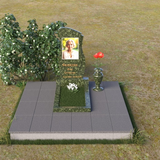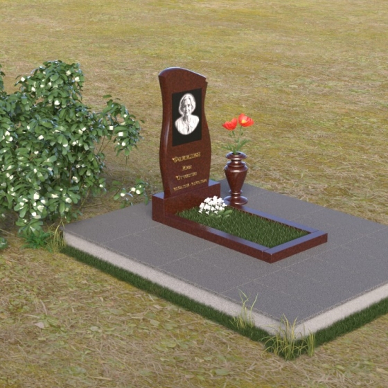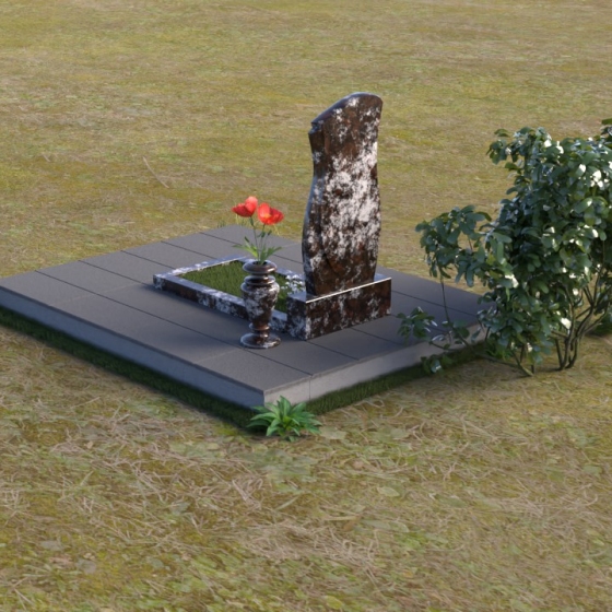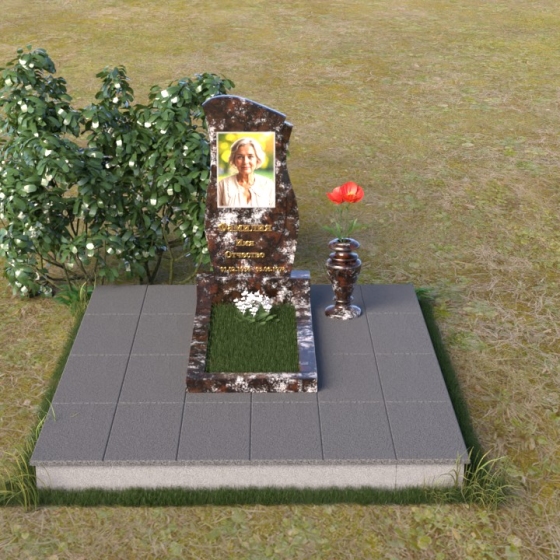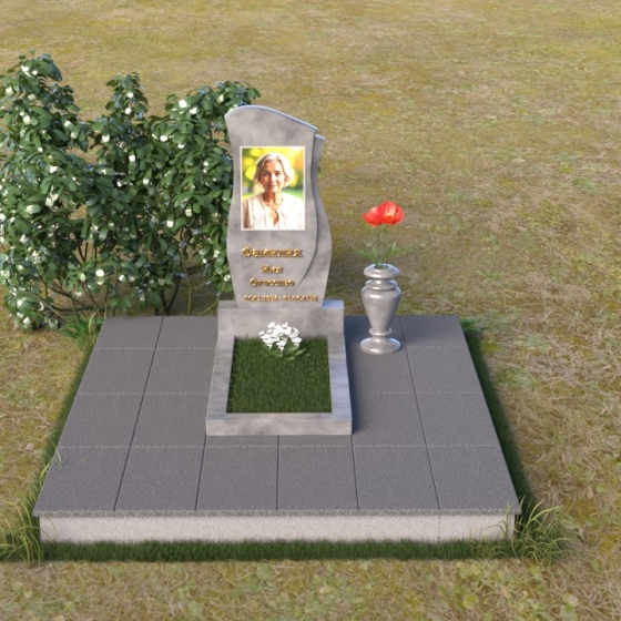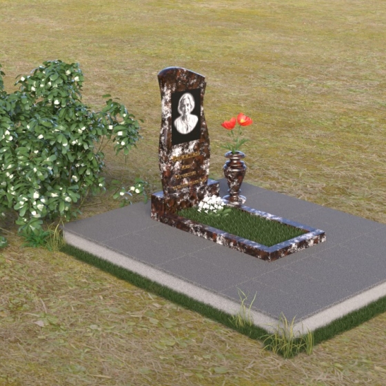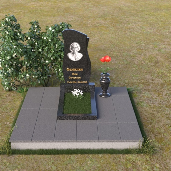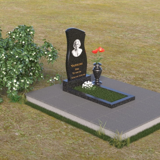 Ниже портрета располагается изящная гравировка с именем и датами жизни усопшего, выполненная четким, легко читаемым шрифтом. Подставка под стелу выполнена в форме прямоугольной плиты с полированной верхней поверхностью, отражающей небо и окружающий пейзаж. Эта плита плавно переходит в горизонтальную надгробную плиту, создавая единую, гармоничную композицию. Ваза, установленная рядом со стелой, выполнена в том же стиле, что и памятник, и служит прекрасным дополнением к общей композиции.