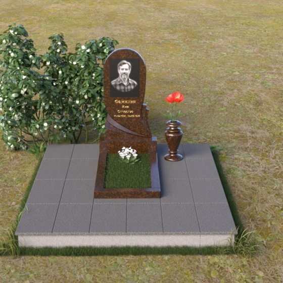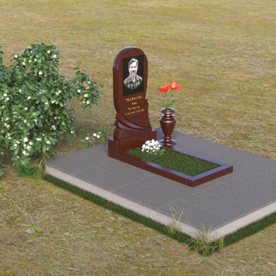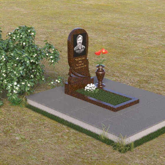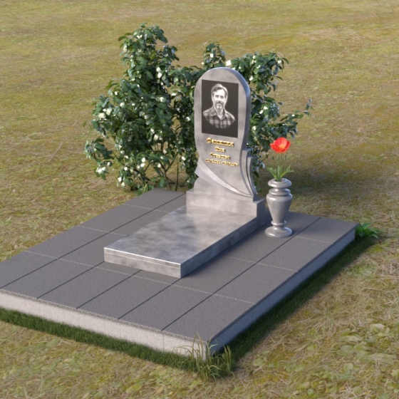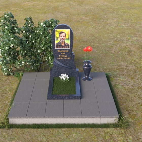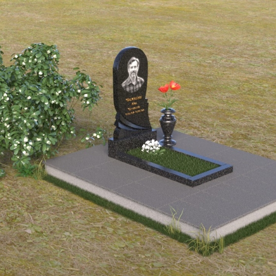 Взгляните на эту изящную мемориальную композицию. Её отличает плавность линий и гармоничное сочетание форм. Стела, выполненная в виде слегка изогнутой арки, словно обнимает выгравированный портрет. Верхняя часть плавно переходит в округлую форму, лишенную острых углов, что придает ей мягкость и умиротворение. Боковые грани стелы искусно обработаны: одна сторона сохраняет полированную зеркальность, отражая свет и создавая ощущение глубины, в то время как другая, в нижней части, переходит в плавный скос, открывая матовую фактуру камня. Этот контраст подчеркивает игру света и тени, добавляя монументу выразительности. В нижней части стелы искусно вырезана драпировка, словно ниспадающая ткань, придающая композиции ощущение легкости и динамики. Под стелой располагается горизонтальная плита, также отполированная до зеркального блеска, создавая эффект водной глади, отражающей небеса. Вместе с вазой лаконичной формы, выполненной в едином стиле, она завершает композицию, придавая ей завершенность и элегантность.